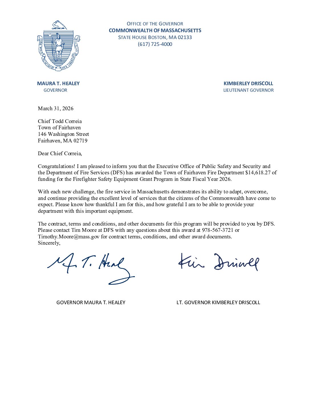 The Fairhaven Fire Department is pleased to announce that we have been awarded a $14,618.27 from the Commonwealth of Massachusetts Firefighter Safety Equipment Grant Program. The funding will be used to replace equipment on fire trucks that has exceeded its lifespan or is no longer operational.